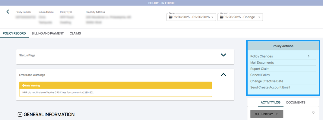 The Policy Actions menu on the Policy Record page provides a list of tasks agents can perform to manage policies. Each action outlines the available self-service features for insurance agents.