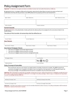 This procedure explains how agents can request a policy assignment. A policy assignment transfers an NFIP policy from the current policyholder to a new policyholder due to a change in ownership.