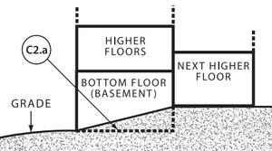 2A Basement The bottom floor is below ground level (grade) on all sides. The basement level measures more than five feet to the floor above it.