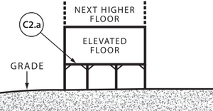 5 Elevated without Enclosure The area below the elevated floor is open, with no obstruction to the flow of floodwaters. Open lattice and insect screening is permissible. "Pier and beam" foundations.