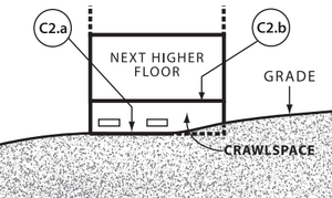 |The main floor is raised above ground by any method, so long as the crawlspace (enclosure) floor sits at or above the surrounding grade. The crawlspace measures five feet or less to the floor above it.