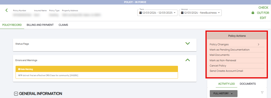 The Policy Actions widget on the Policy Record page provides a list of tasks agents can perform to manage policies. Each action simplifies the maintenance of accurate and up-to-date policy records.