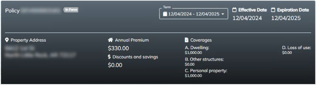 - Shows details like property address, premiums, discounts, and coverages (dwelling, personal property, etc.).
